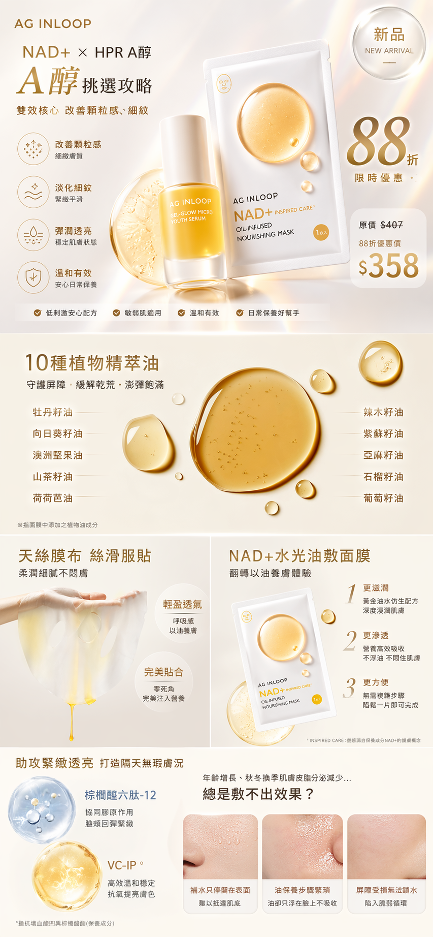 - 搭配NAD+及六胜肽,賦活青春能量,打造緊緻彈嫩膚質。