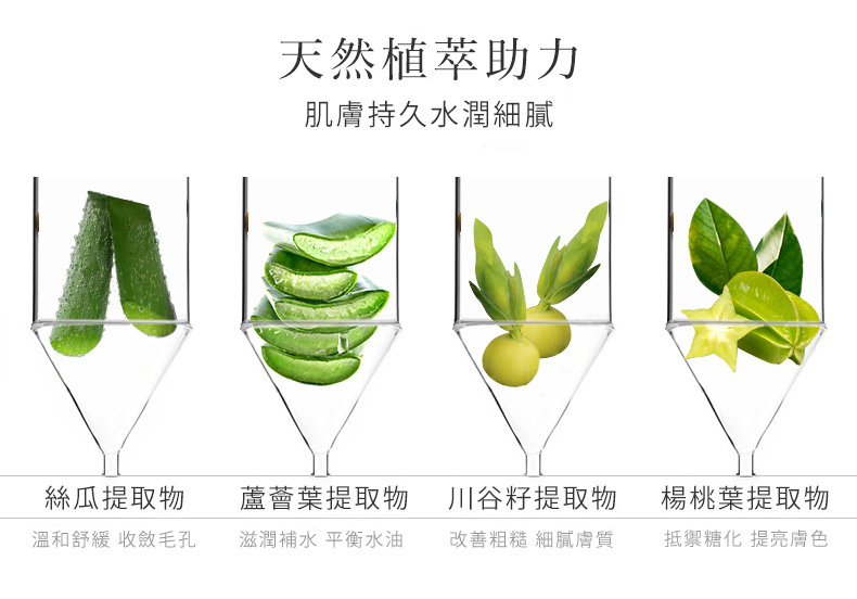 3大植萃保濕抗敏成分,有助收斂鎮靜毛孔,加強滋潤補濕,賦予肌膚水潤嫩滑。