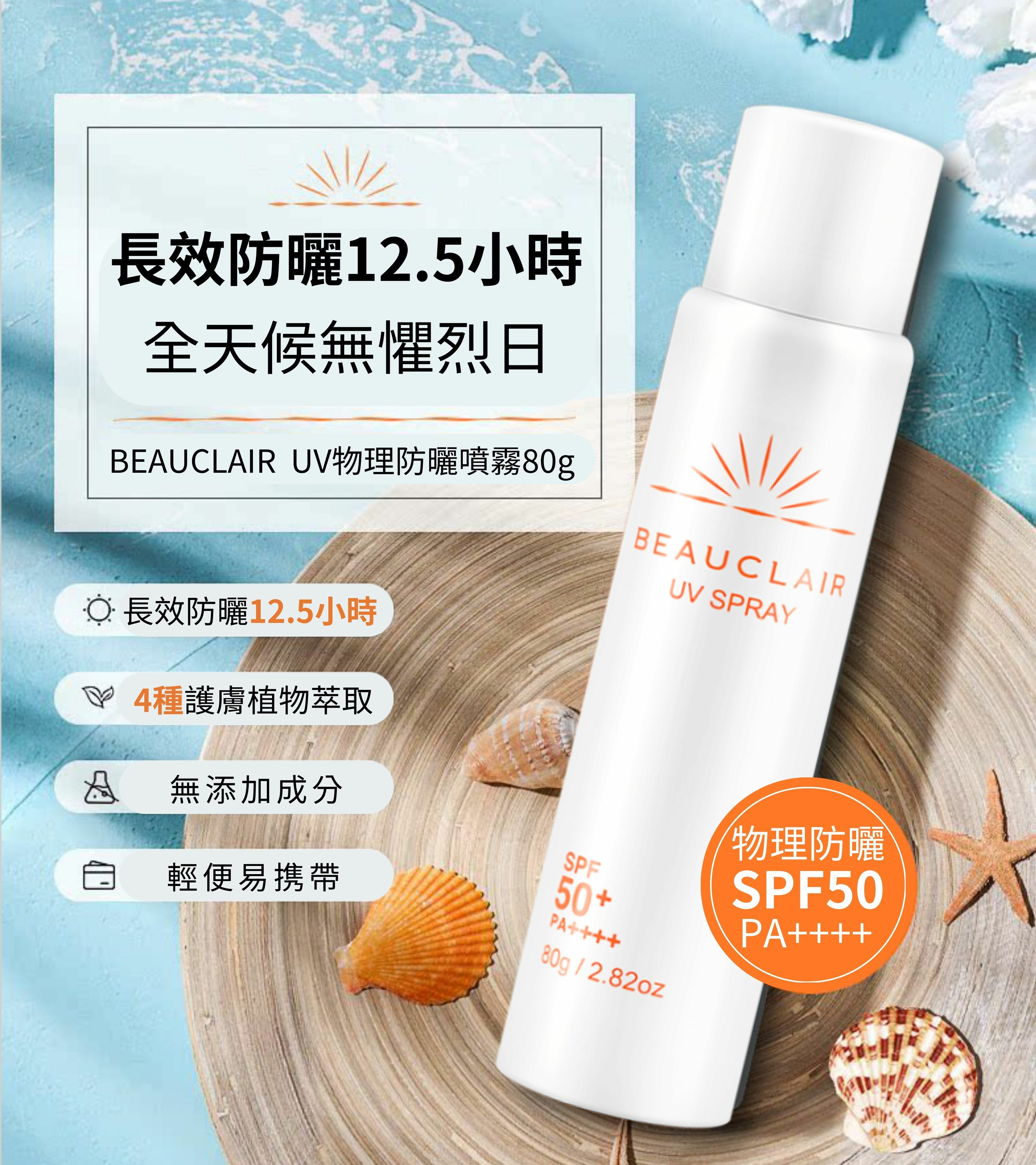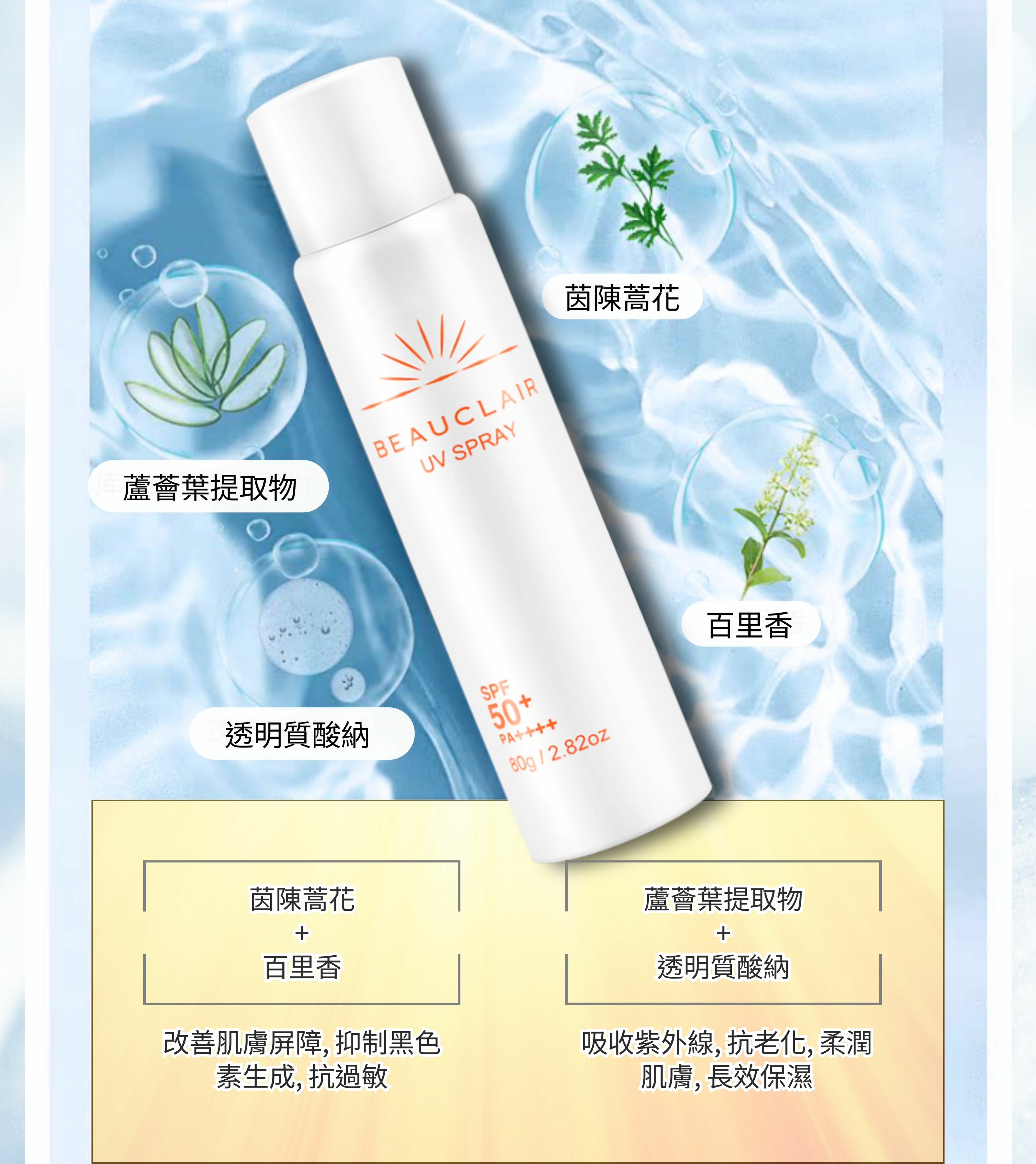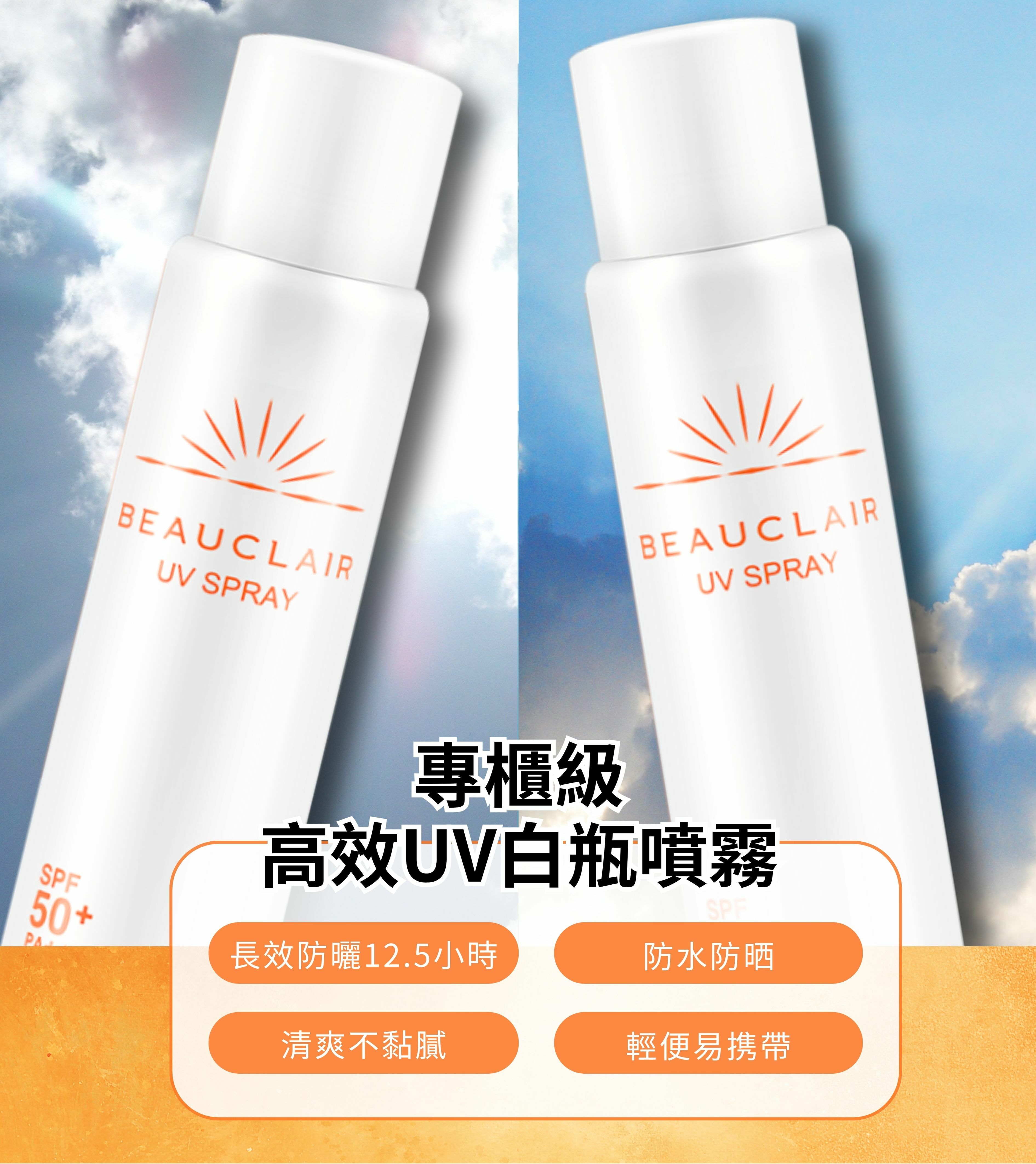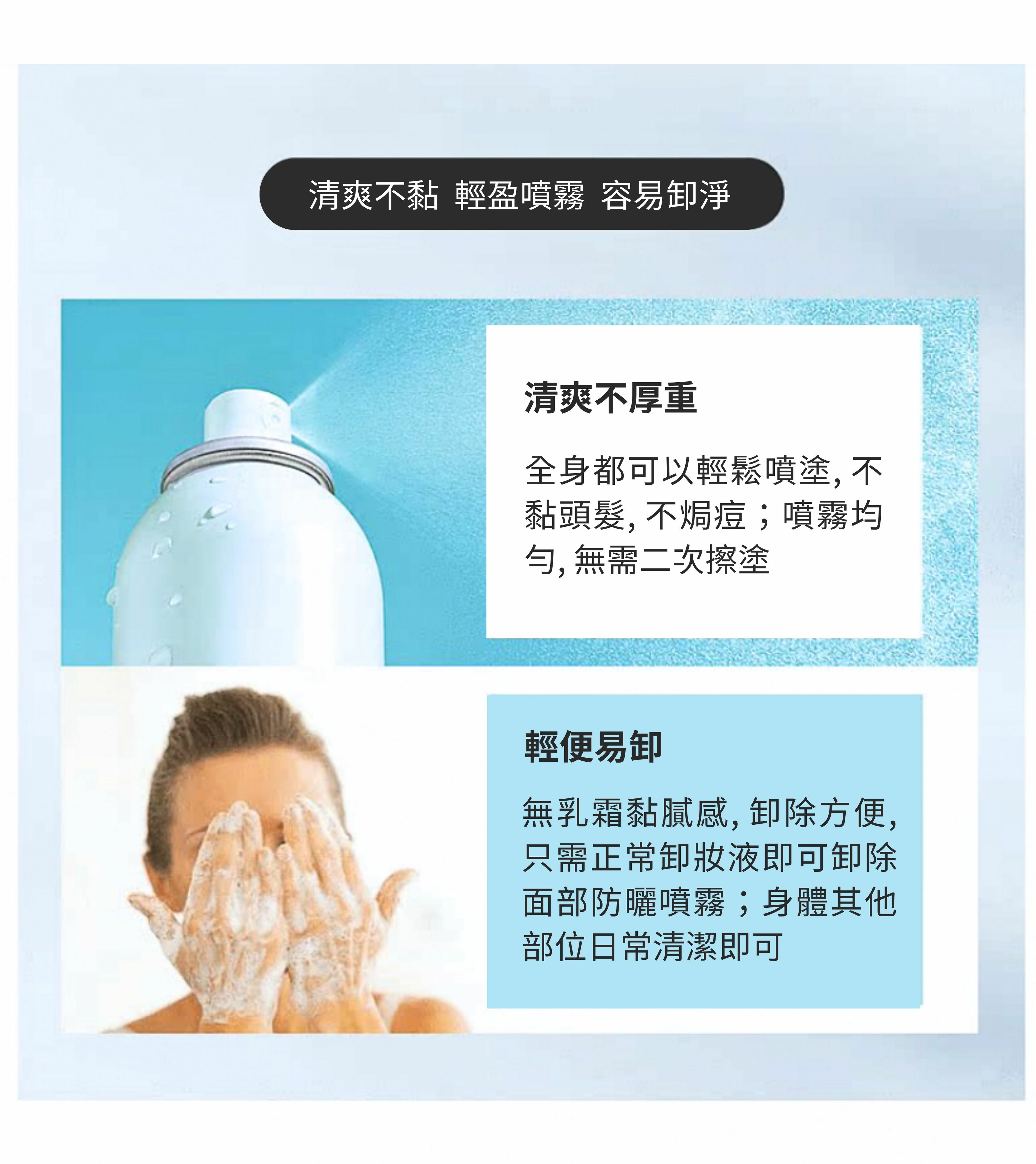 【UV物理防曬噴霧】專櫃級UV防曬好物!!具有SPF50及PA++++防曬指數,超強效持久抵禦UVA和UVB等有害的紫外線!長達12.5小時全面防曬~添加多重植物精華,同步抑制黑色素、高效補濕、抗老化及改善肌膚屏障。