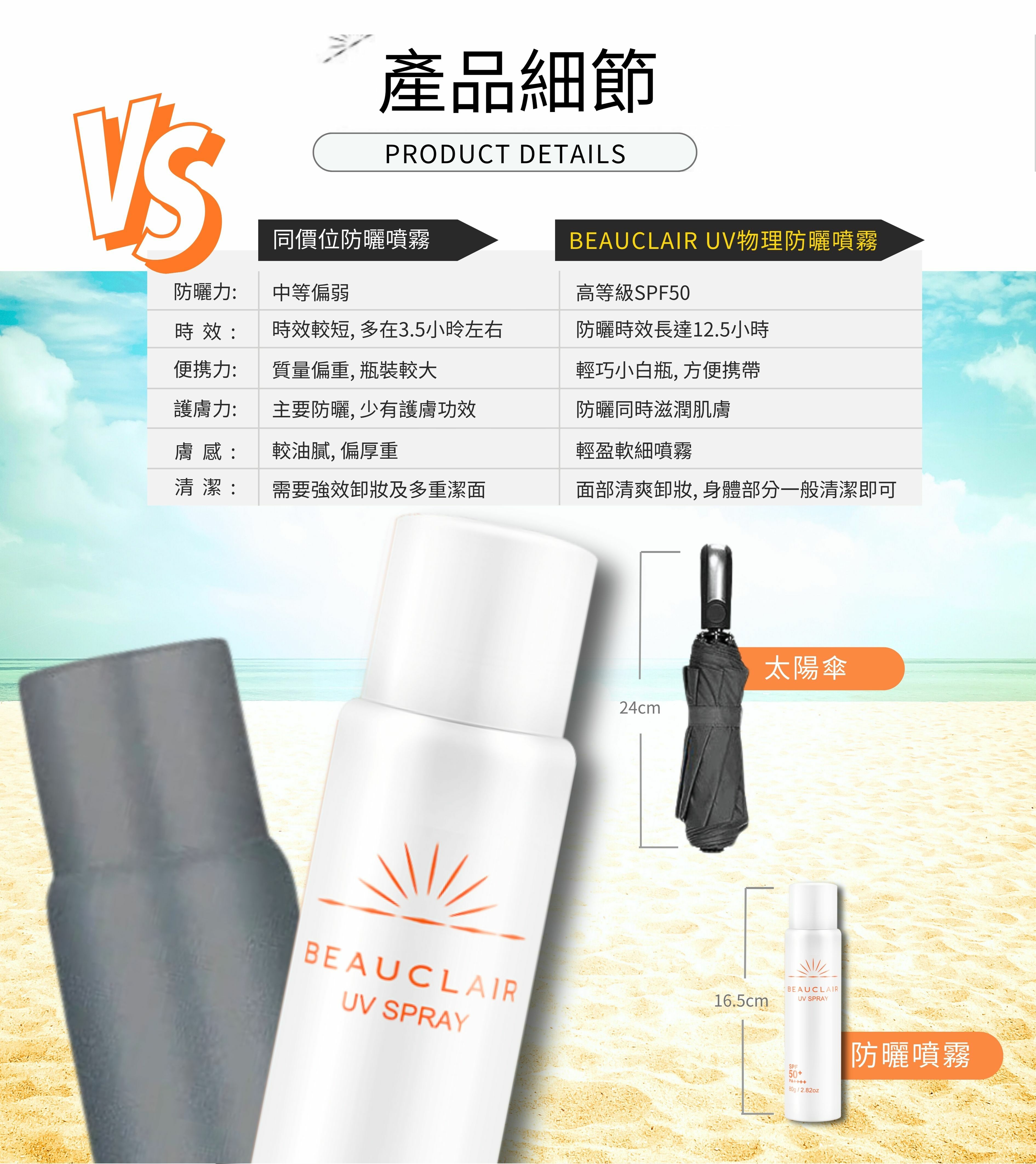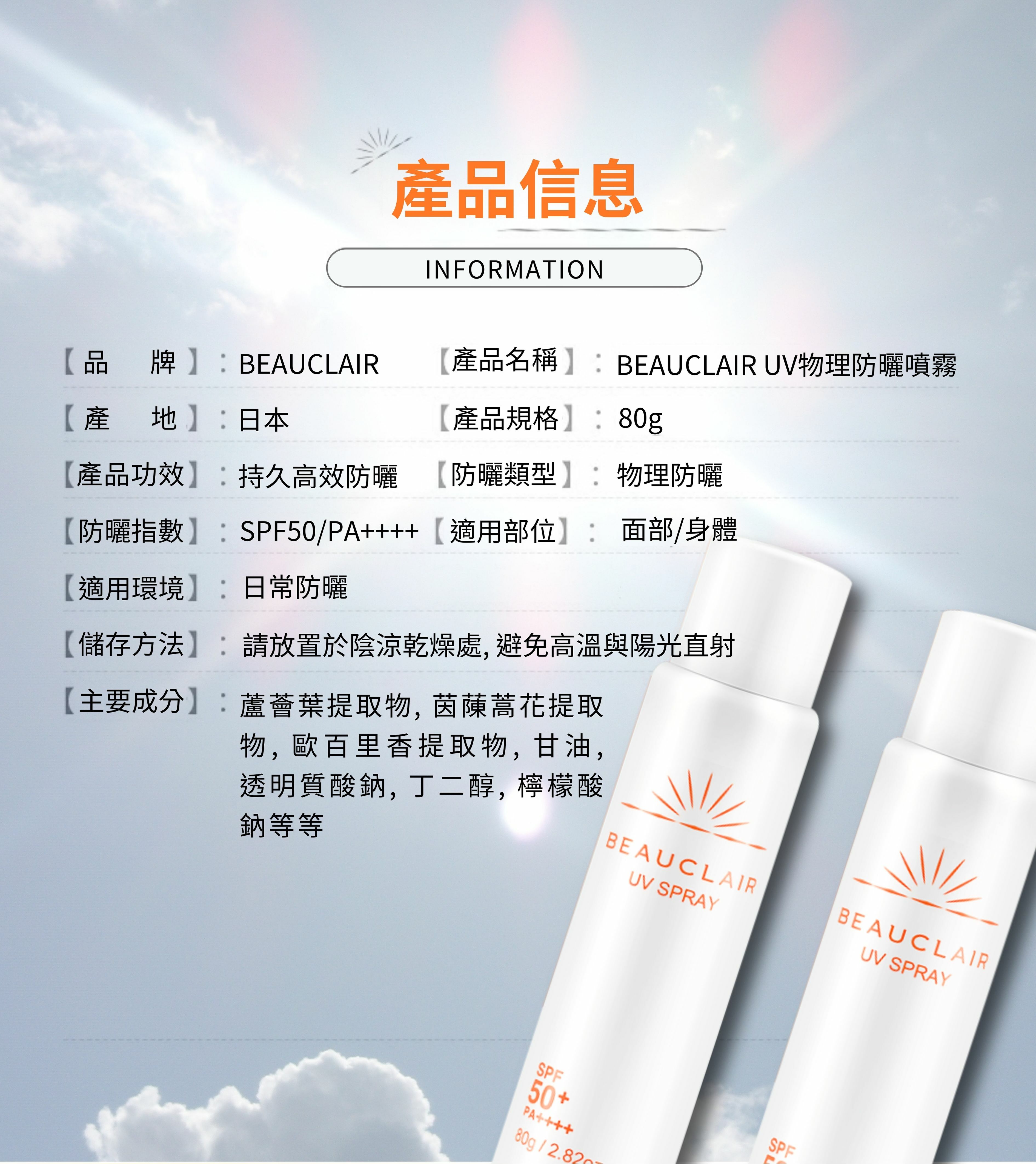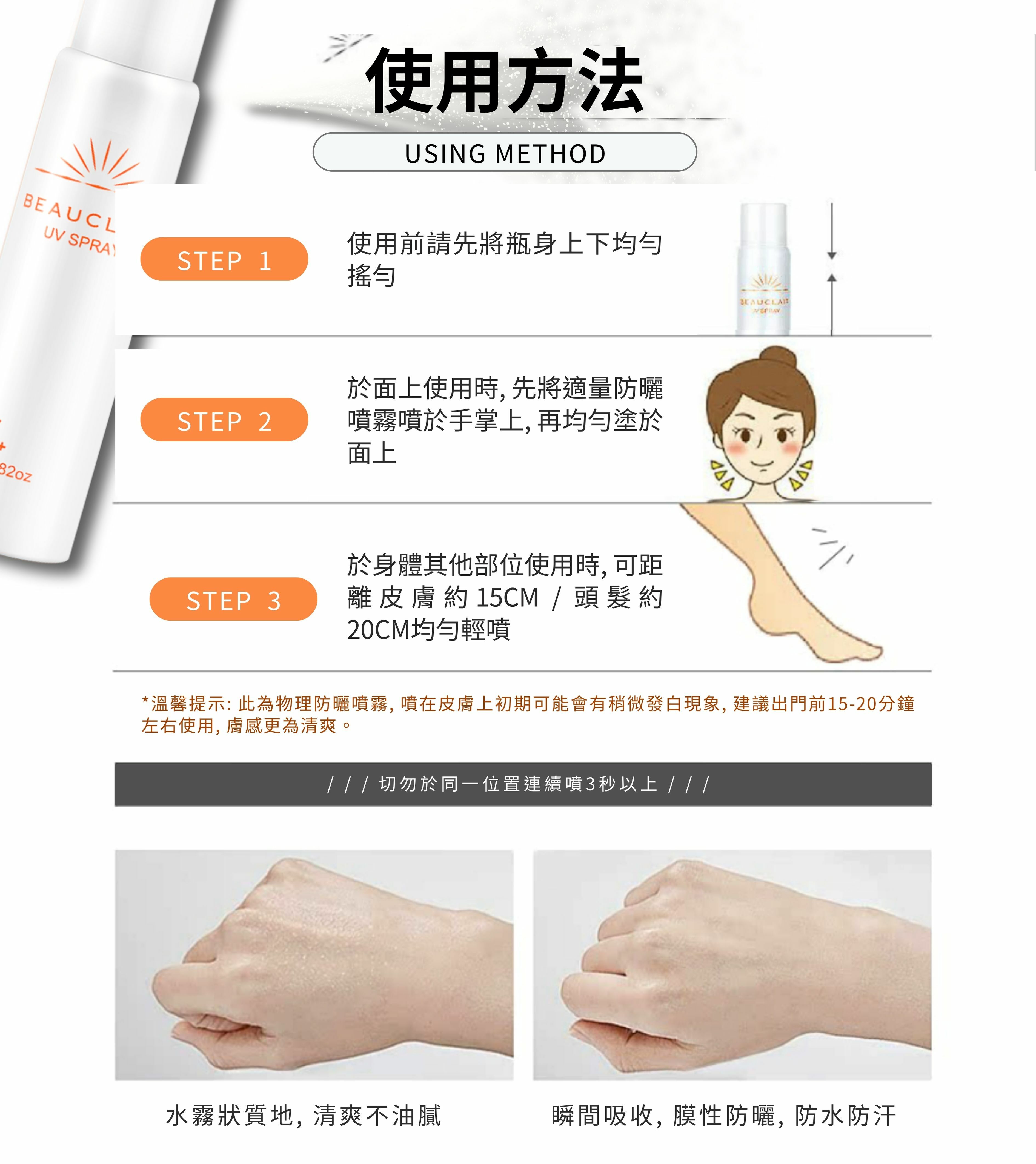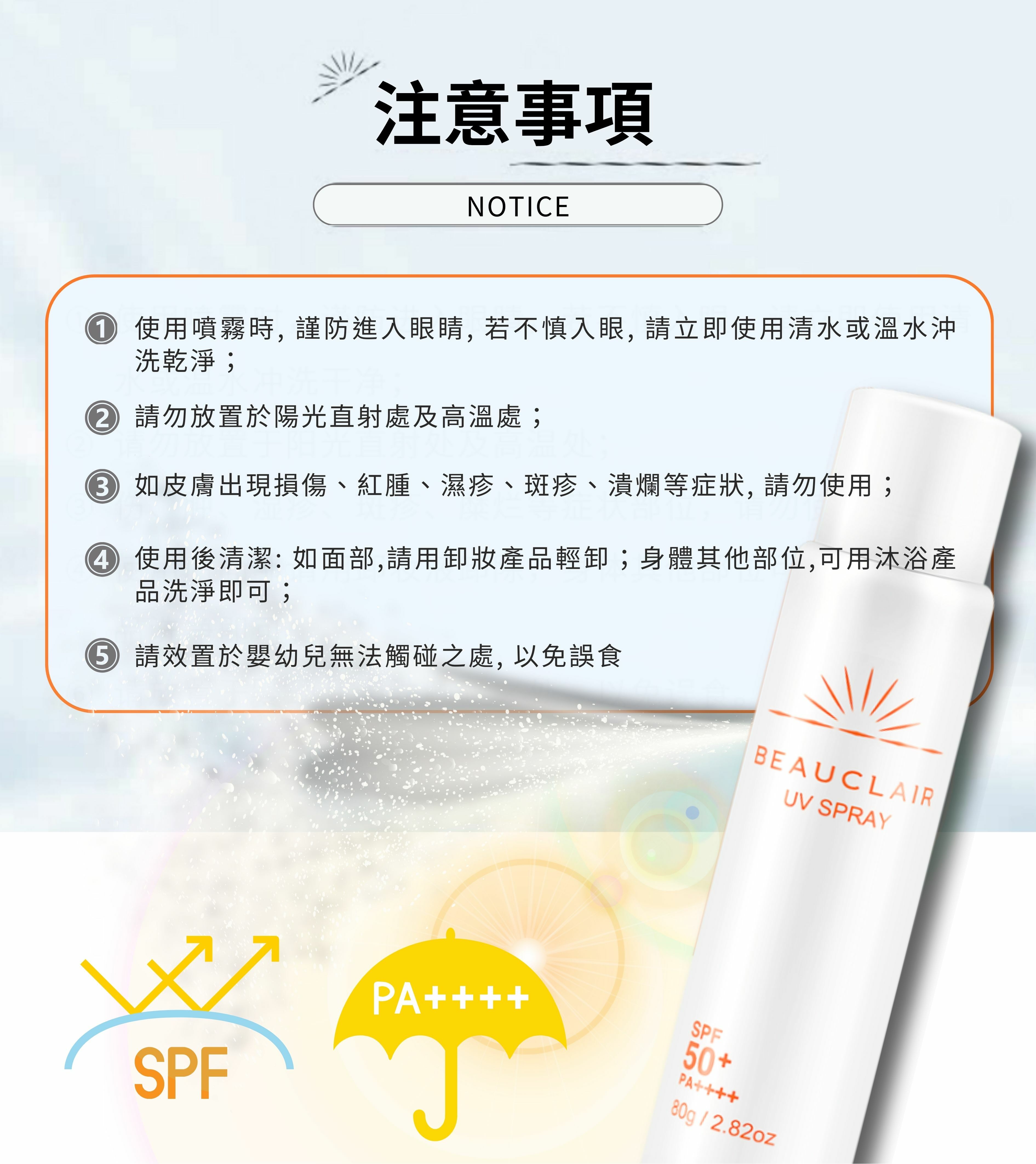 【UV物理防曬噴霧】專櫃級UV防曬好物!!具有SPF50及PA++++防曬指數,超強效持久抵禦UVA和UVB等有害的紫外線!長達12.5小時全面防曬~添加多重植物精華,同步抑制黑色素、高效補濕、抗老化及改善肌膚屏障。