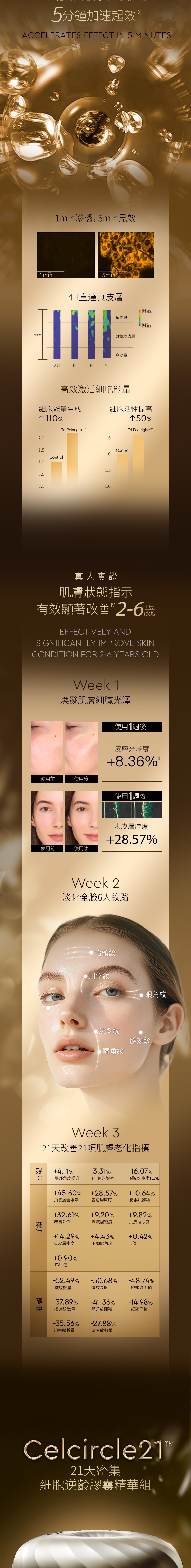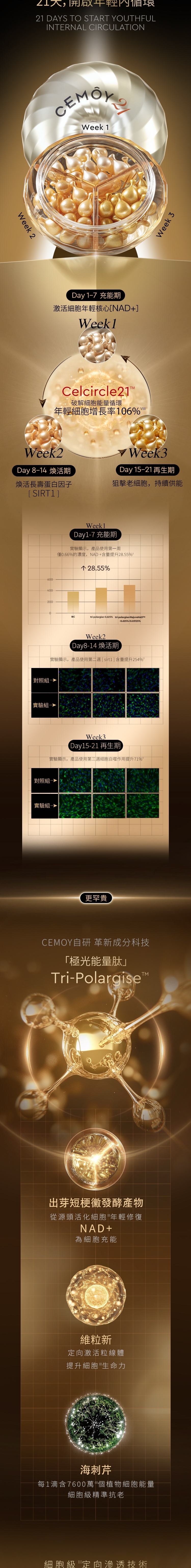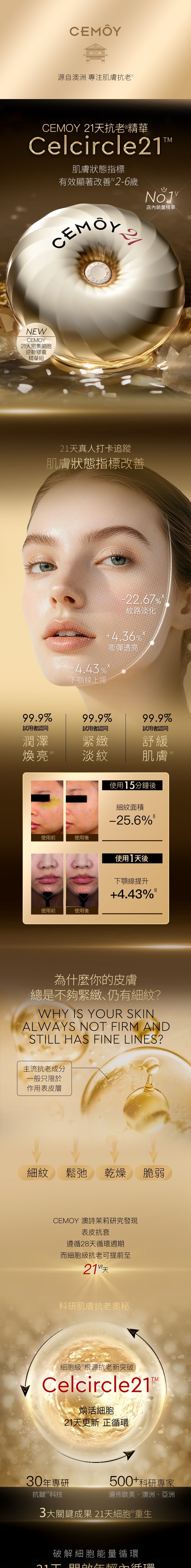 - CEMOY 21天密集抗皺緊緻膠囊精華組(0.4mL x 42粒) x 1盒 :首創CelCircle21™21天分段式細胞抗老技術,遵循細胞煥新周期,以細胞內能量循環為核,分段式活化三大諾獎靶點,打破滲透吸收壁壘,21天自啟細胞更新循環,從細胞根源煥活肌膚能量。