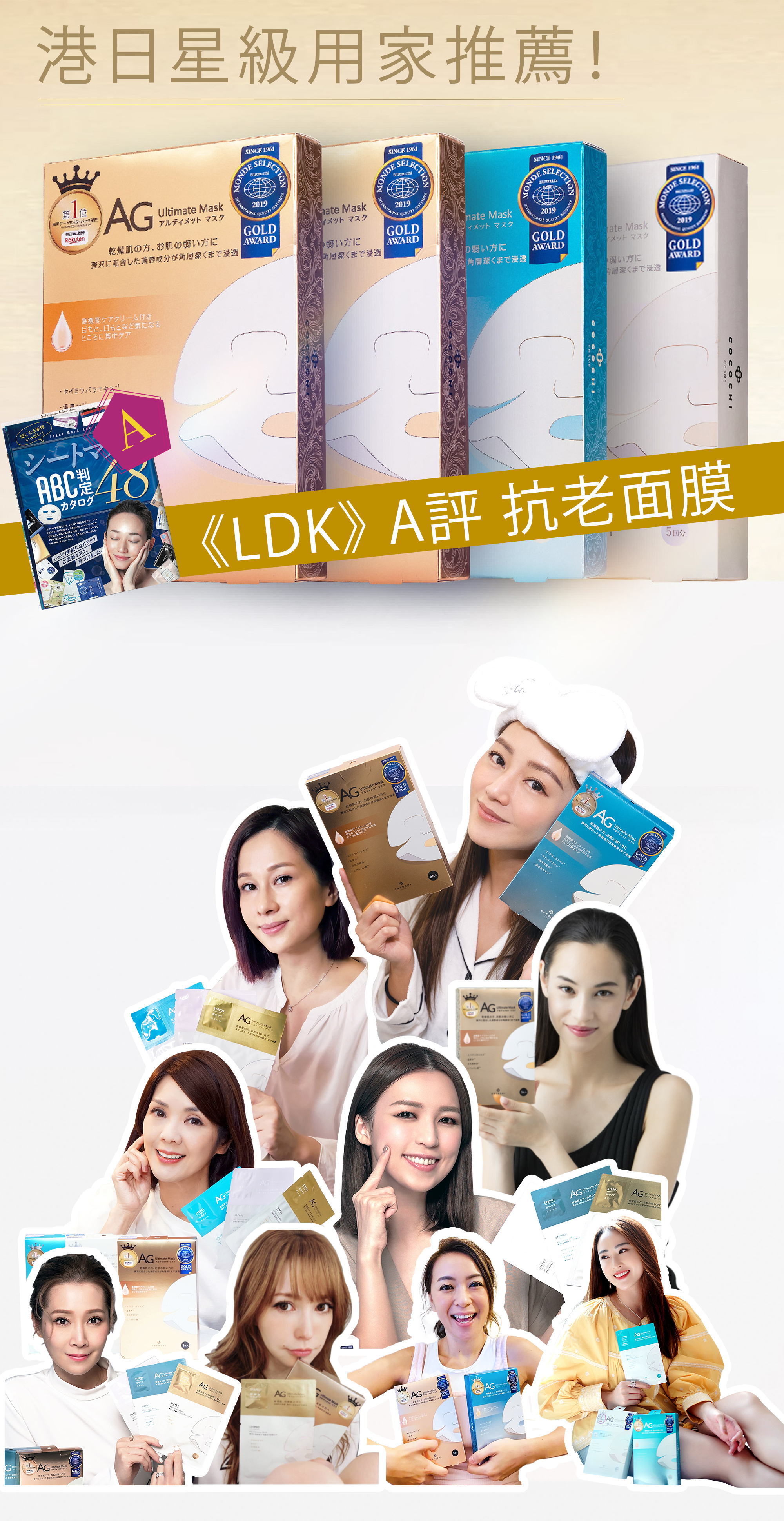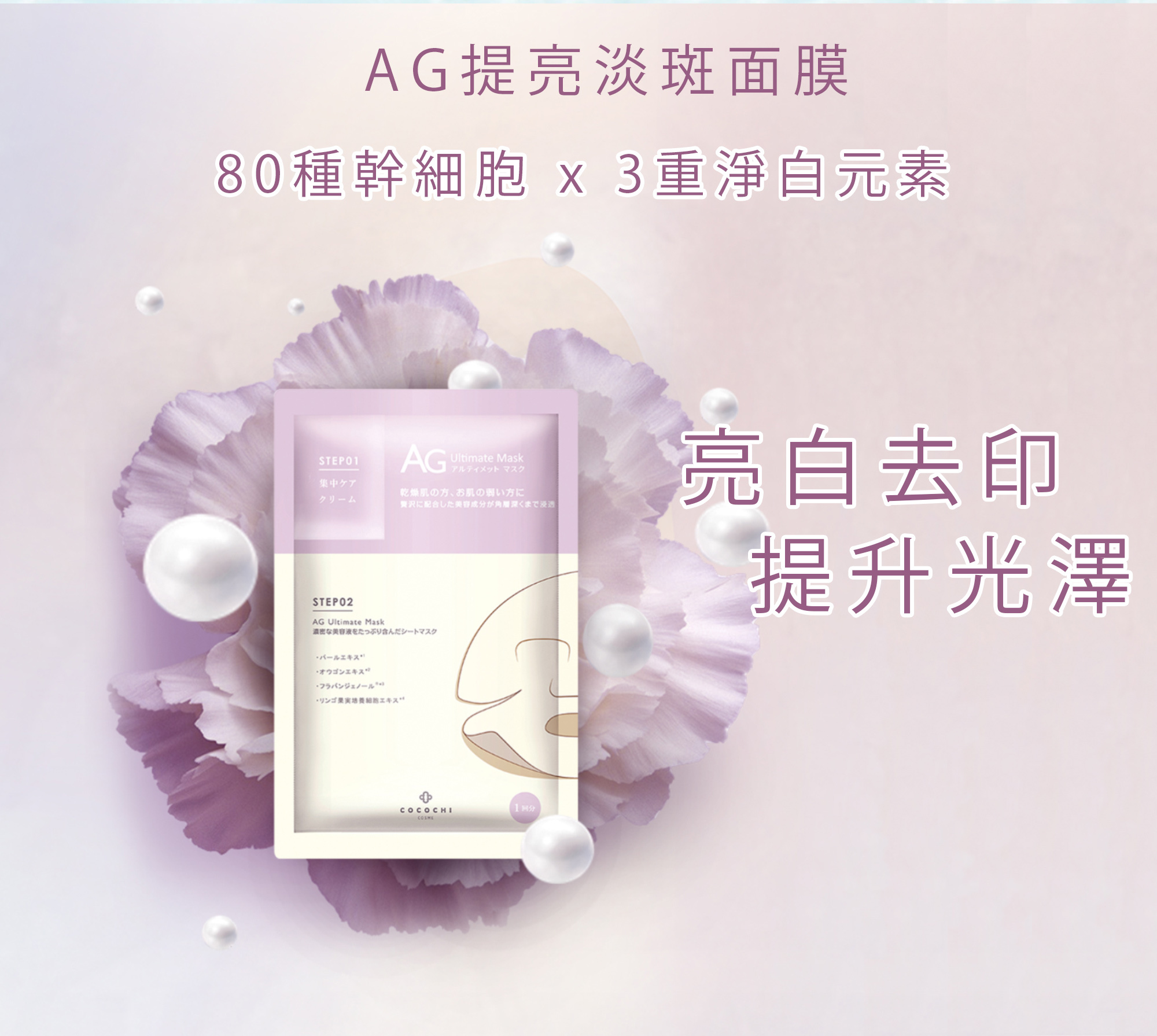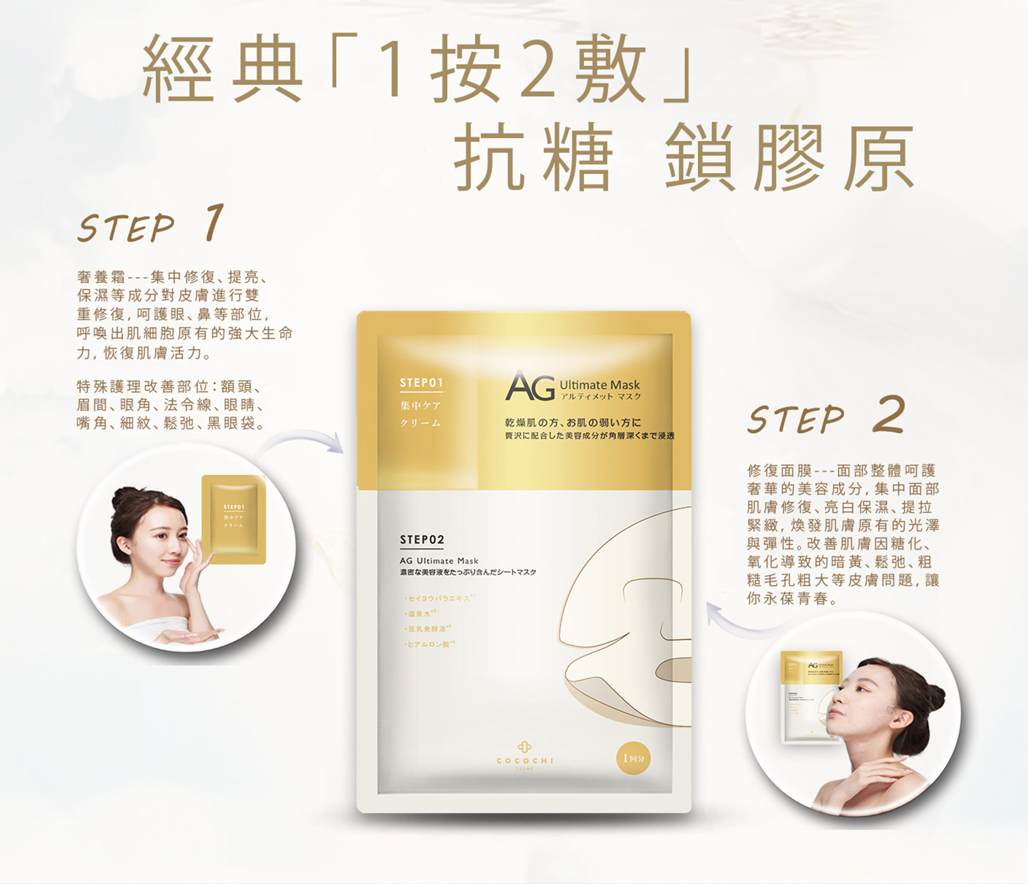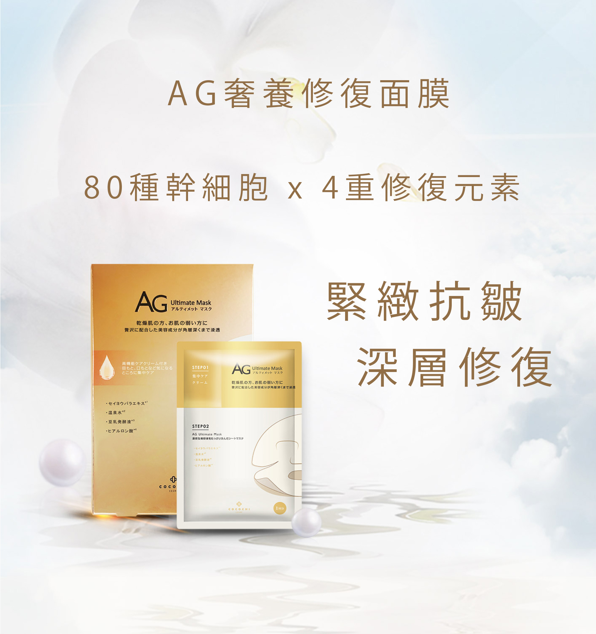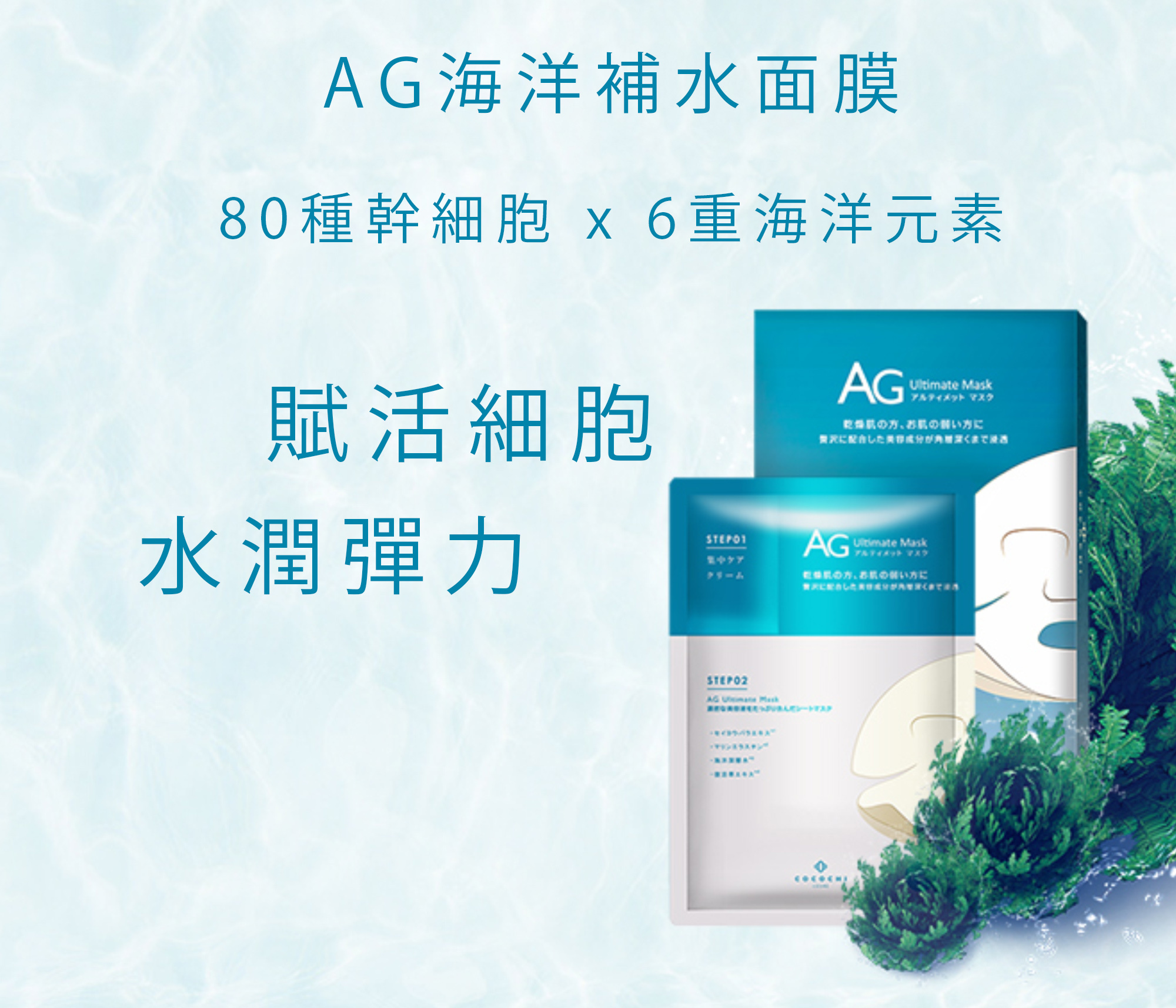 1按2敷設計,每片獨立附有「幹細胞奢養霜」,針對眼紋、虎紋、毛孔位置,滲透率特高,超適合成熟鬆弛肌!自選人氣「AG 海洋補水面膜」或「 AG奢養修復面膜」或「 AG 提亮淡斑面膜」配搭,任選4片$99 !即時體驗幹細胞LOCK膠原療程!