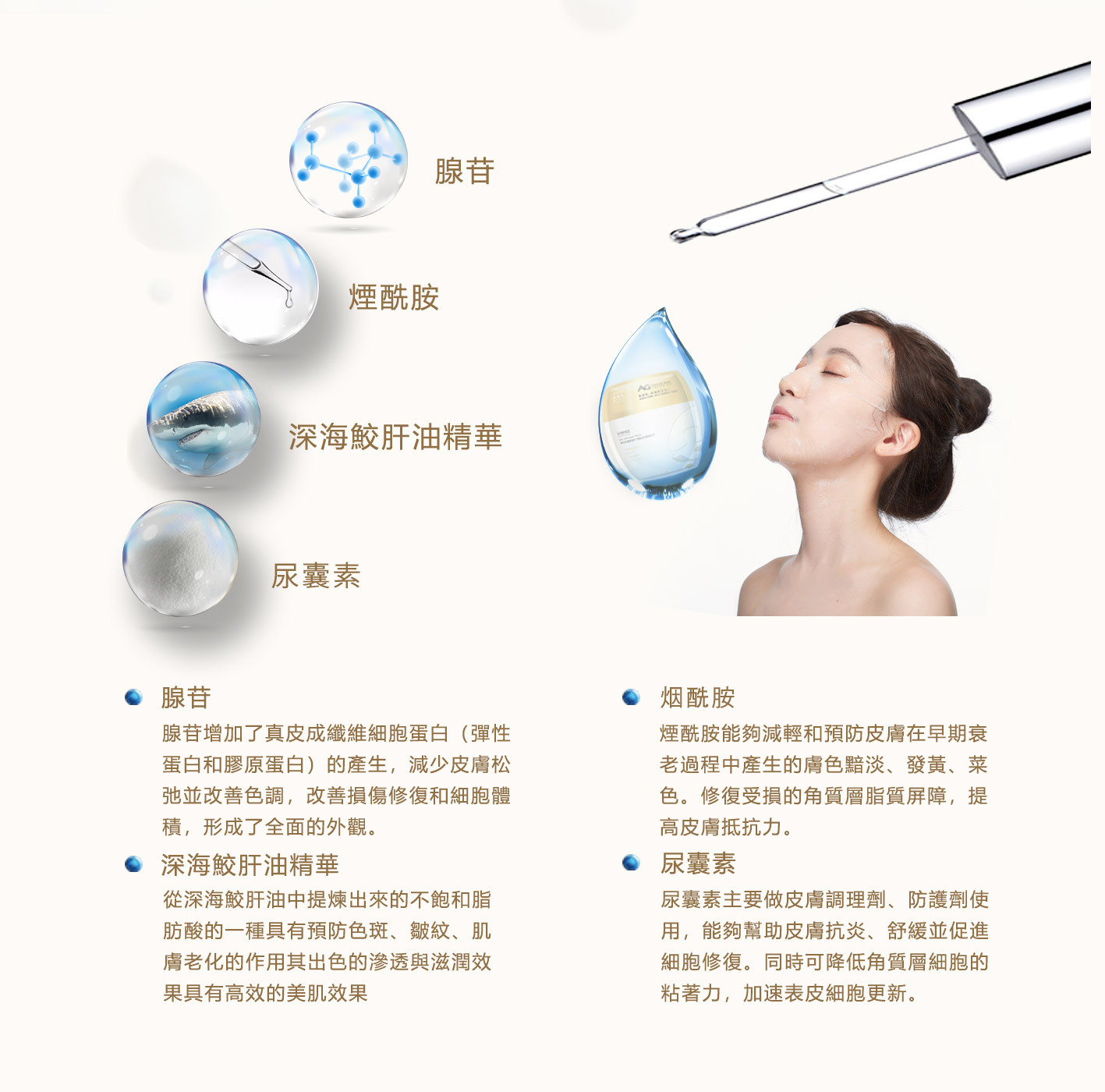 •腺苷、鯊烯精華、烟醯氨、尿囊素組成高黏合修護成分,全方位修復老化受損細胞,極致滲透滋潤細胞,促進纖維細胞蛋白的生成,改善皺紋、色斑、鬆弛、浮腫、暗沉等問題,肌膚即時提升,緊緻亮白