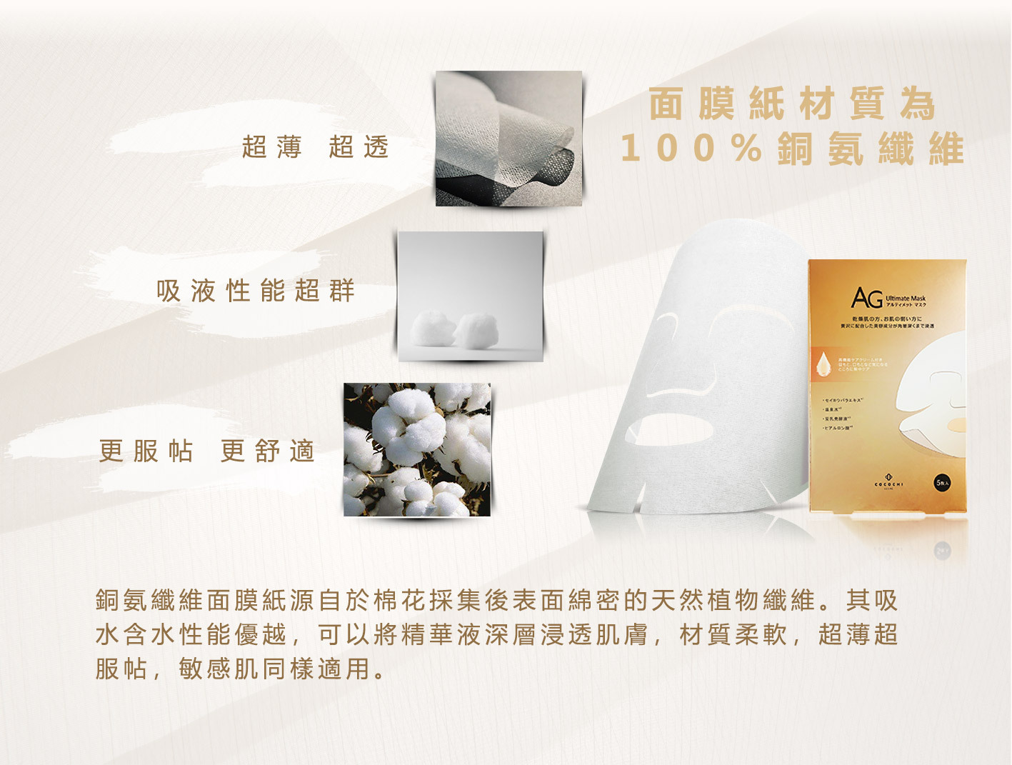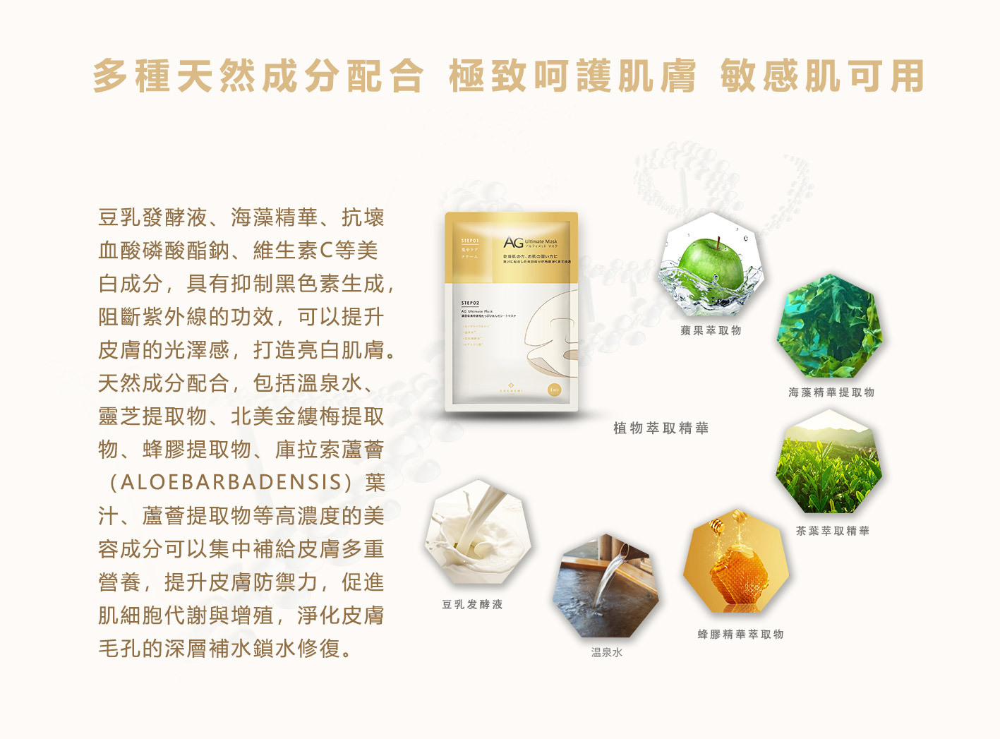 •結合豆乳發液、鯊烯精華、海藻精華、蜂膠精華、北美金縷梅精華、西洋柳樹皮精華、洋薔花水、庫拉索蘆會葉精華、甜扁桃、茶葉萃取精華、維他命C和E而成的小分子植物幹細胞,能直達真皮層激活細胞的養療級面膜,提升肌膚防禦力,令皮膚緊緻無紋,充滿亮白光澤!