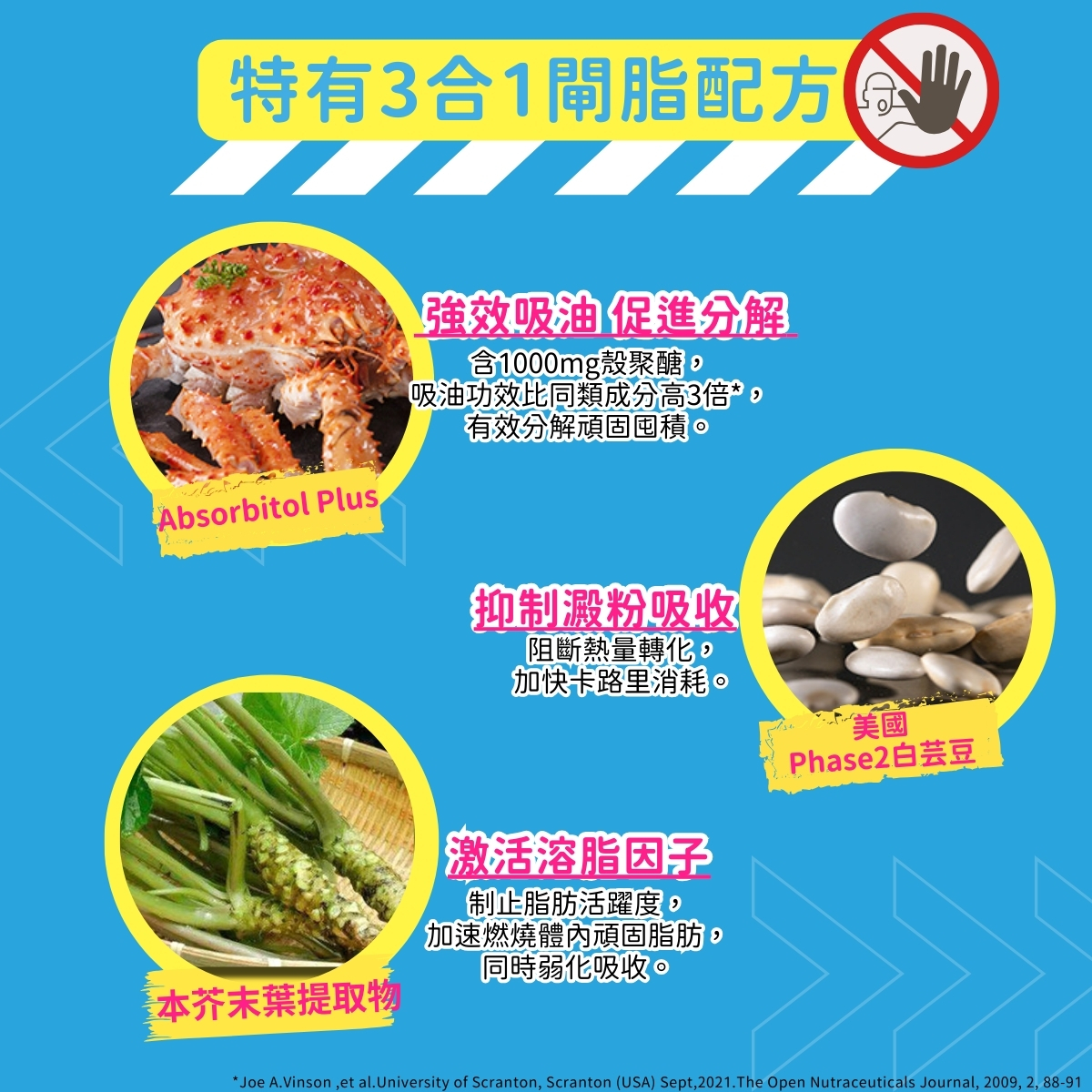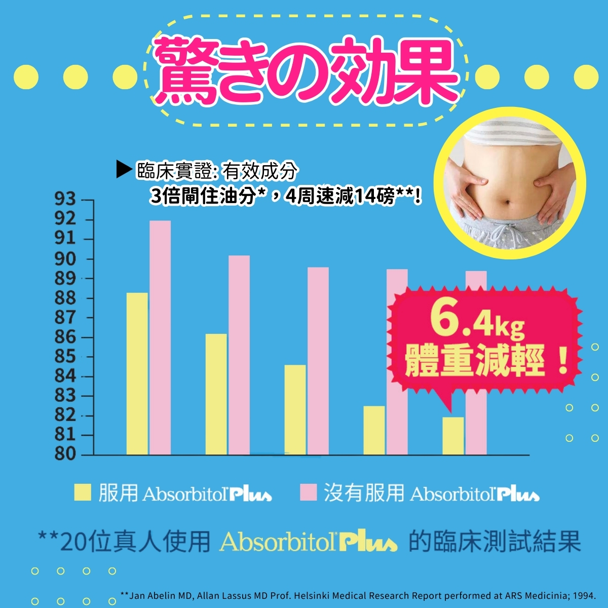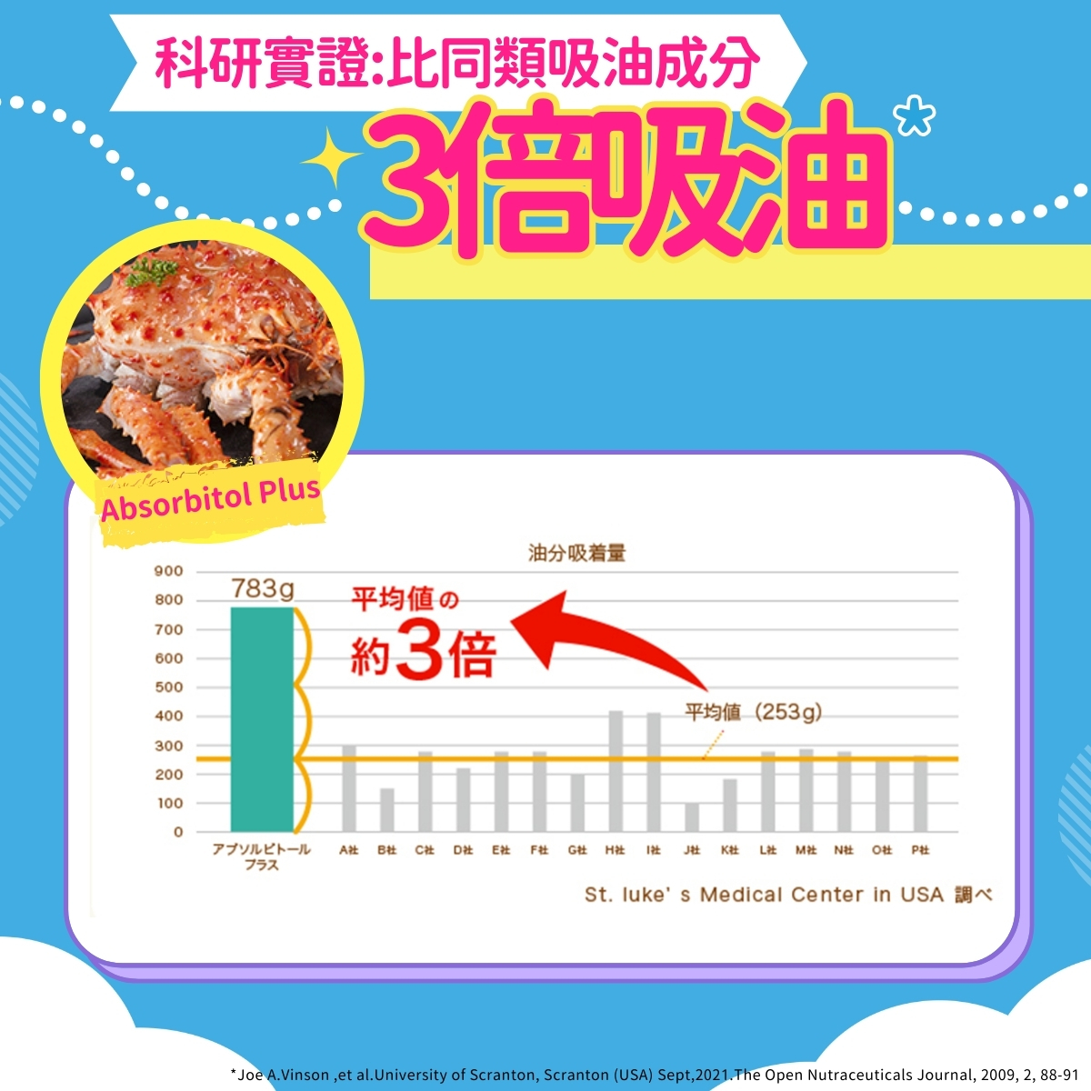✔️ AbsorbitolPlus:吸油功效比起同類成分高3倍*,有助降低腸胃吸收壞脂激活溶脂因子