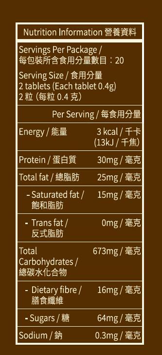 成份:翅莢決明精華粉末、黑薑提取物、α-環糊精、多穀麹、增稠劑(E463)、、抗結劑(E470i,E551)、上光劑(E904)、明日葉提取物粉末、酵母、珊瑚鈣、紅酒提取物
